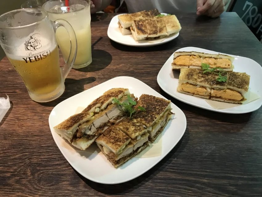 コーヒーとキャラメルマキアートを買って、西宮駅改札外のベンチに座って飲もうとしたら、向かいにあるカレー屋だったところが「勝山堂」というお店になってて、かつサンドを売ってる。